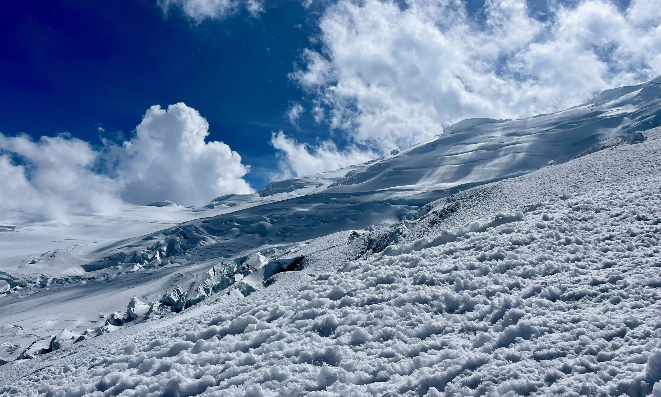 Sweeping up from the glacier one thousand meters below, the imposing west face of Nevado Copa, with its domed summit at 6188m, is a complex mass of twisting crevasses, seracs, and vast fields of nieves penitentes. Whilst never too steep, weakening snow bridges and intricate route finding give ample cause for caution.