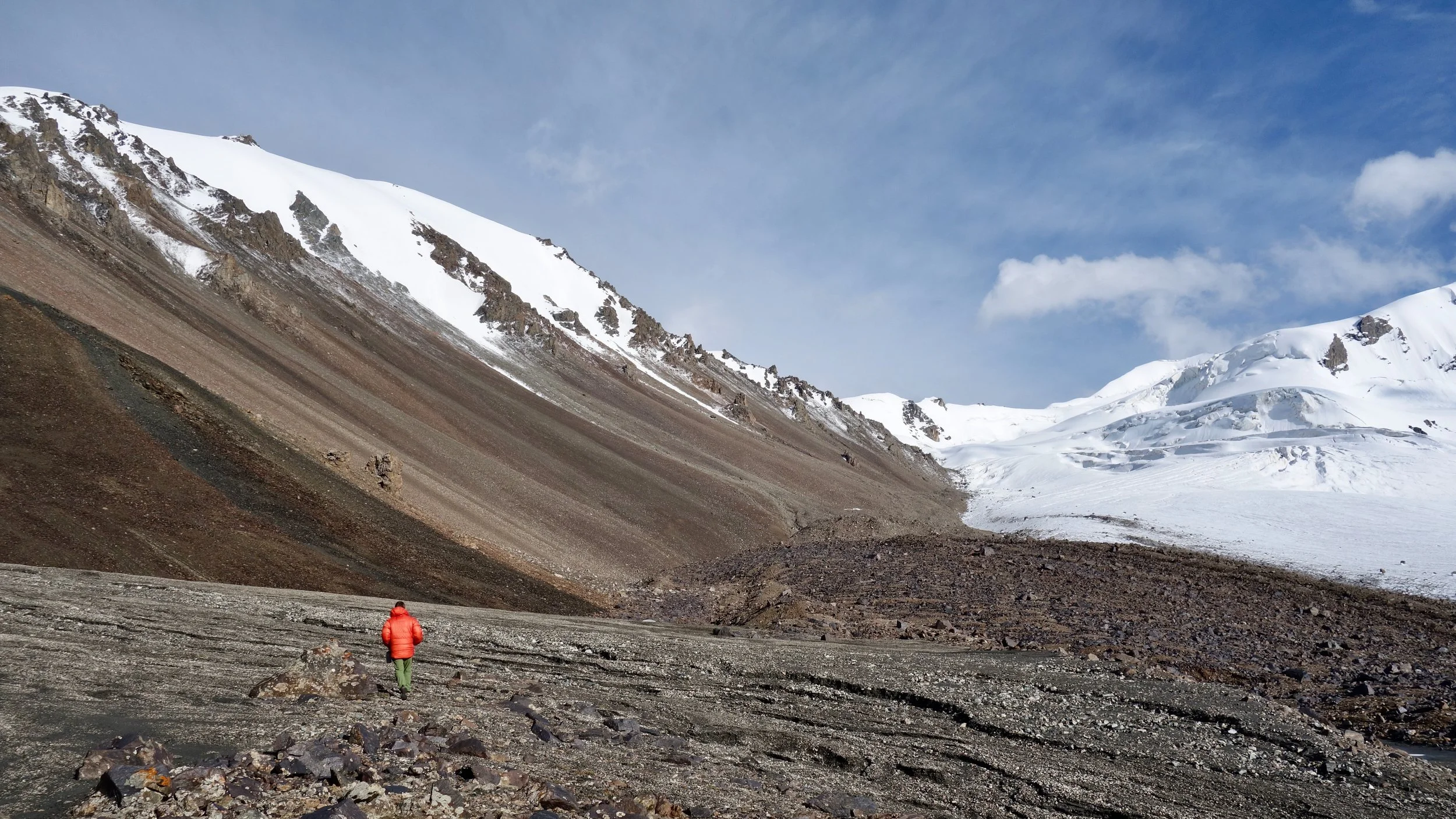The upper reaches of the East Bordlu Glacier and the northern flanks of the Pk 4842, Kuiluu Range, Kyrgyzstan.