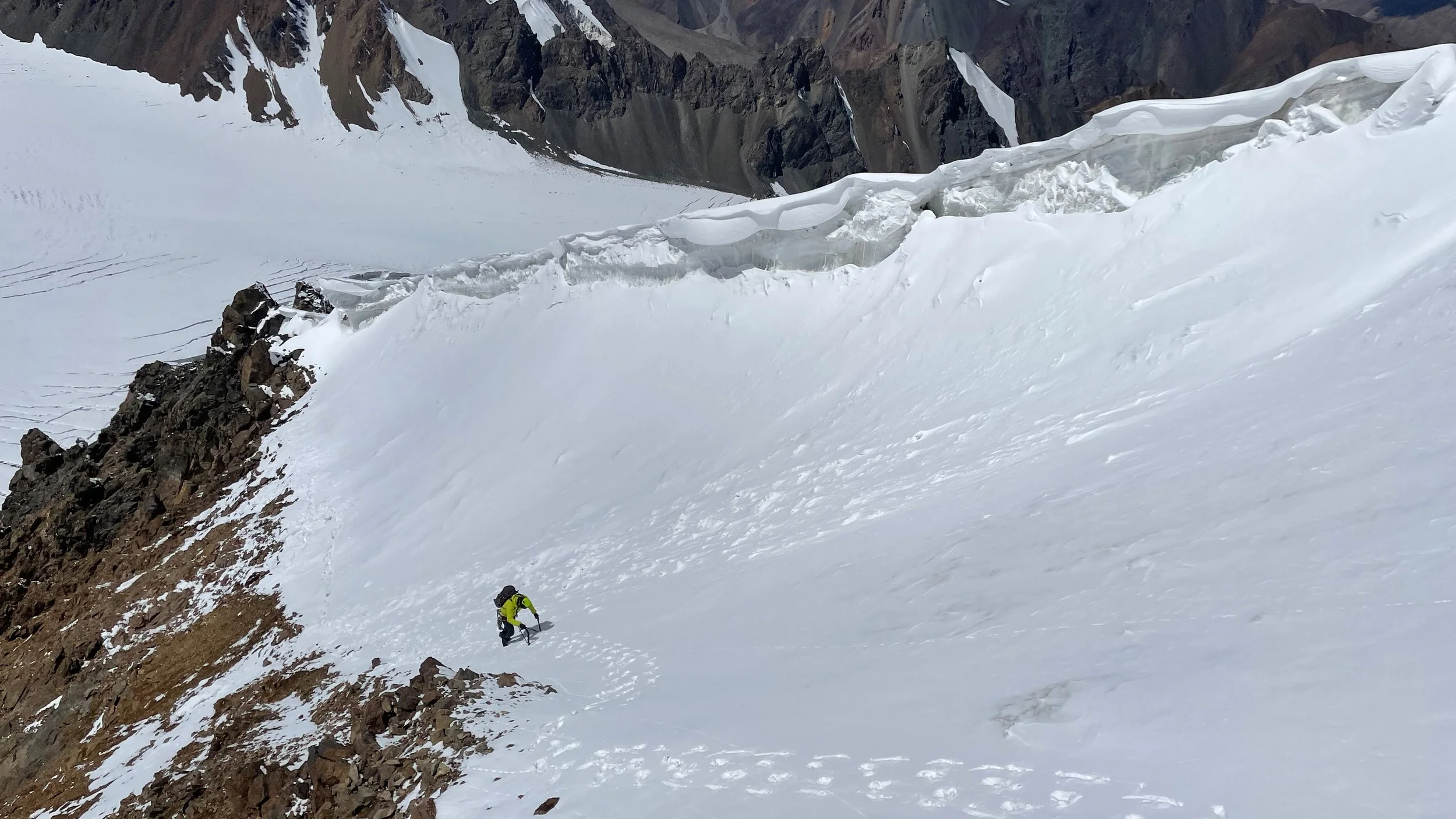 Our spur on Pk 4788 culminated in a giant snow bowl sweeping upwards towards the main ridgeline. Seracs scooped over the rim, and wind-driven spindrift tumbled into the ether. We cautiously crossed the bowl, wary to avoid the fall line of any serac debris, and joined the ridge just short of the summit, reuniting with our footsteps from the previous day. The wind had picked up, so we made the call to descend via the normal route. We took a moment to admire the panorama before making our descent back to our tents on the moraine some 600m below.
