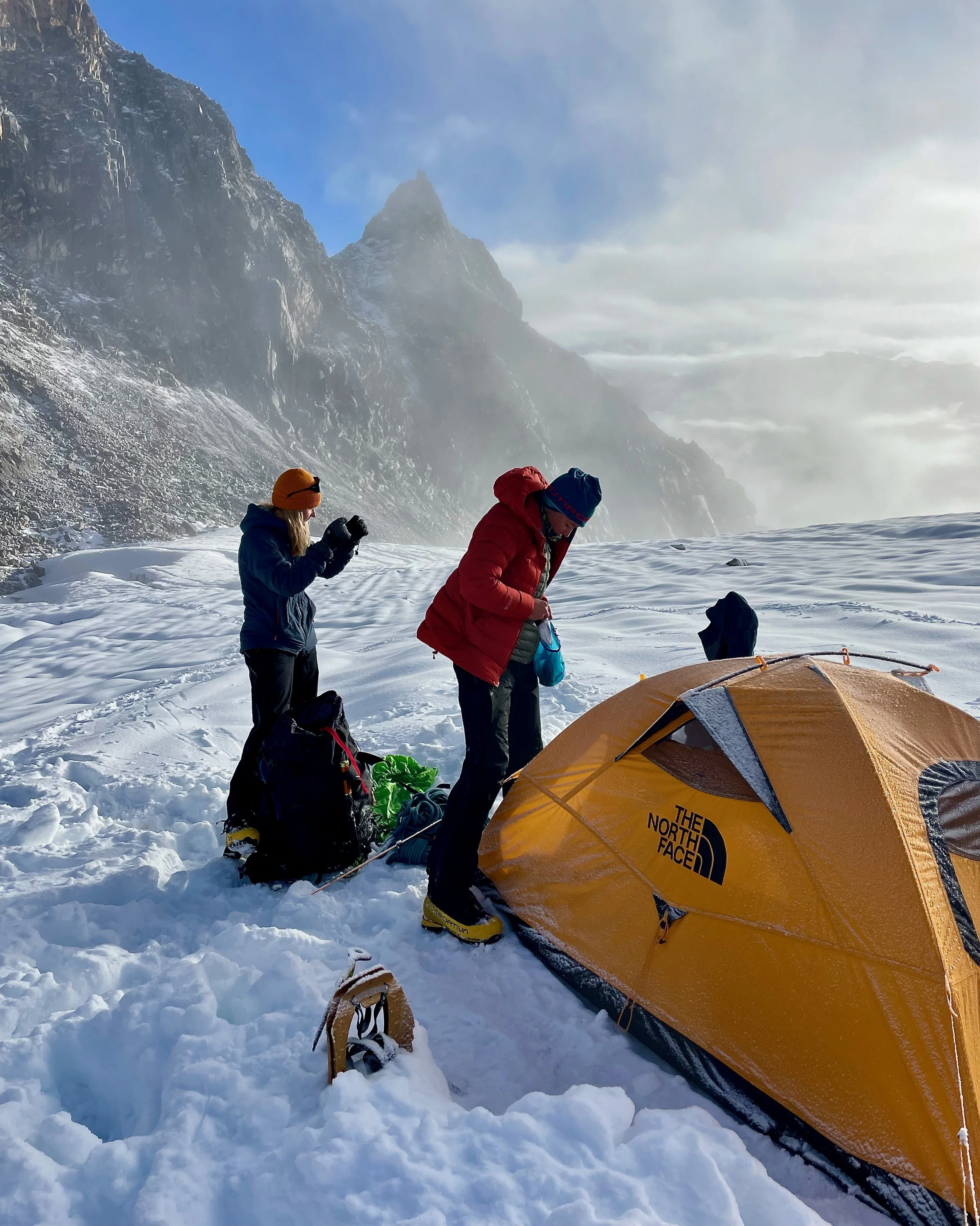Kasia (left) and Ula organising gear in the deep cold of an early morning as we establish camp on the glacier. Snowshoes and an axe are securely stored, half buried in the snow, and encrusted in a fine layer of frosted ice.