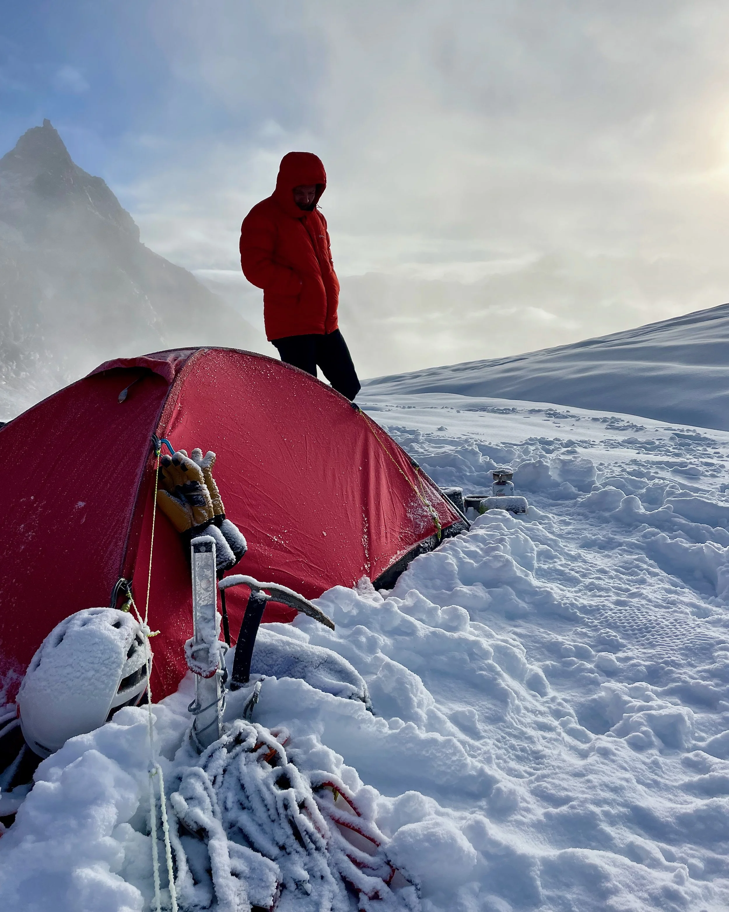 Thomas prepares to melt snow for tea on a frigid morning at our glacial camp. With no room in the tiny single-skin tent for storing gear, we dig a cache at the rear and clip our possessions to the outside of our little red home.