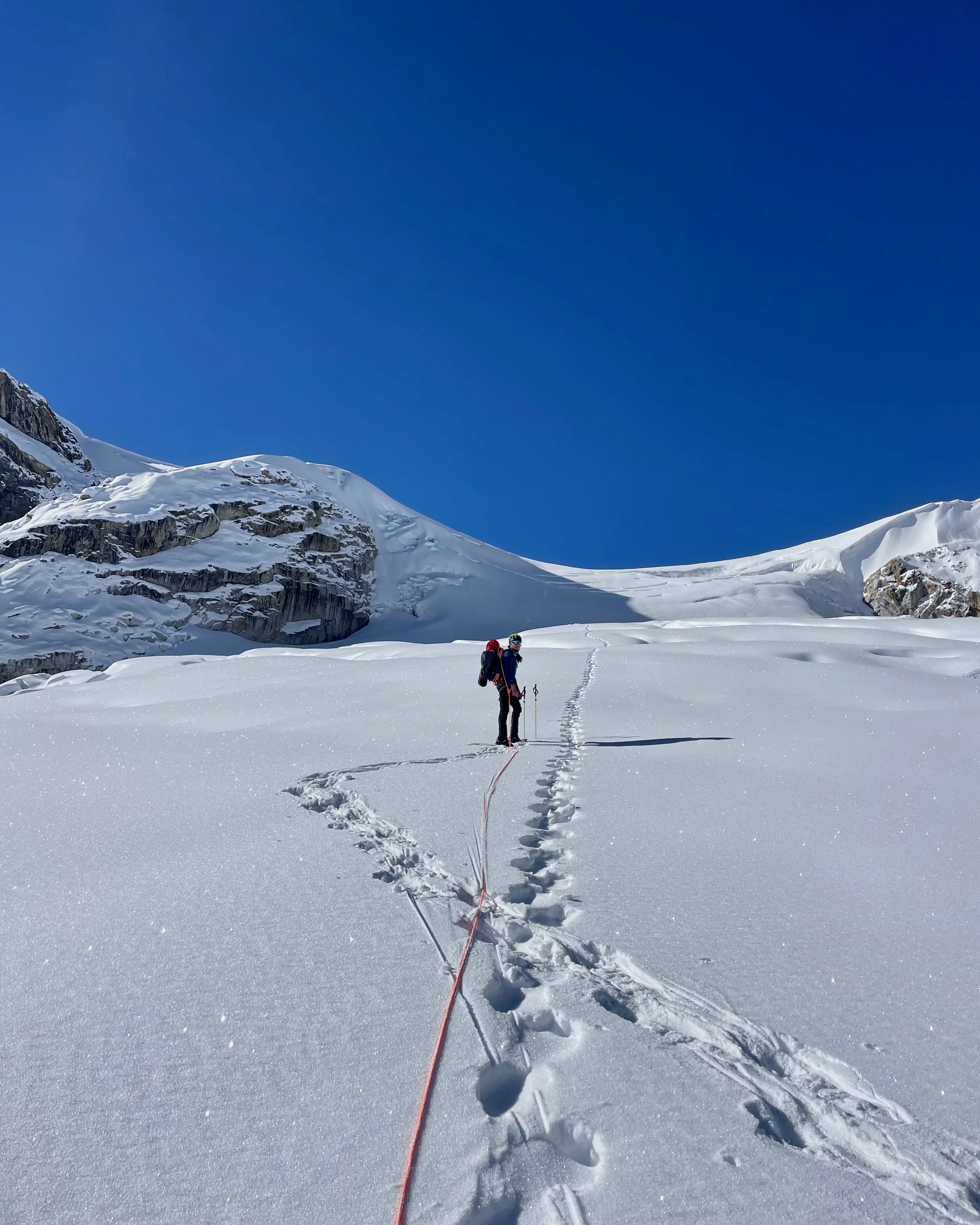 The snow is deep and simply moving over the glacier is exhausting. With each step, I kick myself a little more for leaving my snowshoes at base camp. A stupid mistake that is costing me energy and my sense of self-worth with every step. They would have been perfect in these conditions, far more useful on this glacier than crampons alone, and I watch Tom smugly leading ahead with his proudly strapped to his boots. We laugh it off, joking and loudly complaining in equal measure about this damn white powder. It often amuses me how we seek out these snowy lands, drawn to their immense challenge and beauty, yet once immersed we almost constantly protest about how every aspect of our existence has become more difficult.