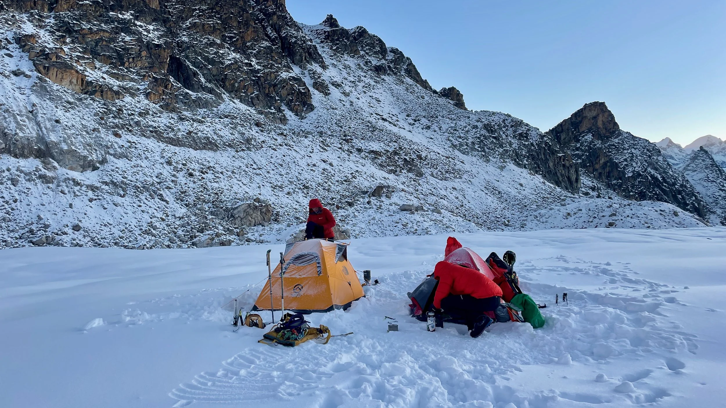 Emerging the next morning, surrounded by fresh powder we are treated to a beautiful sunrise, bathing this wild landscape in hues of deep orange and purple. We enjoy breakfast and tea before embarking on the arduous descent to base camp.