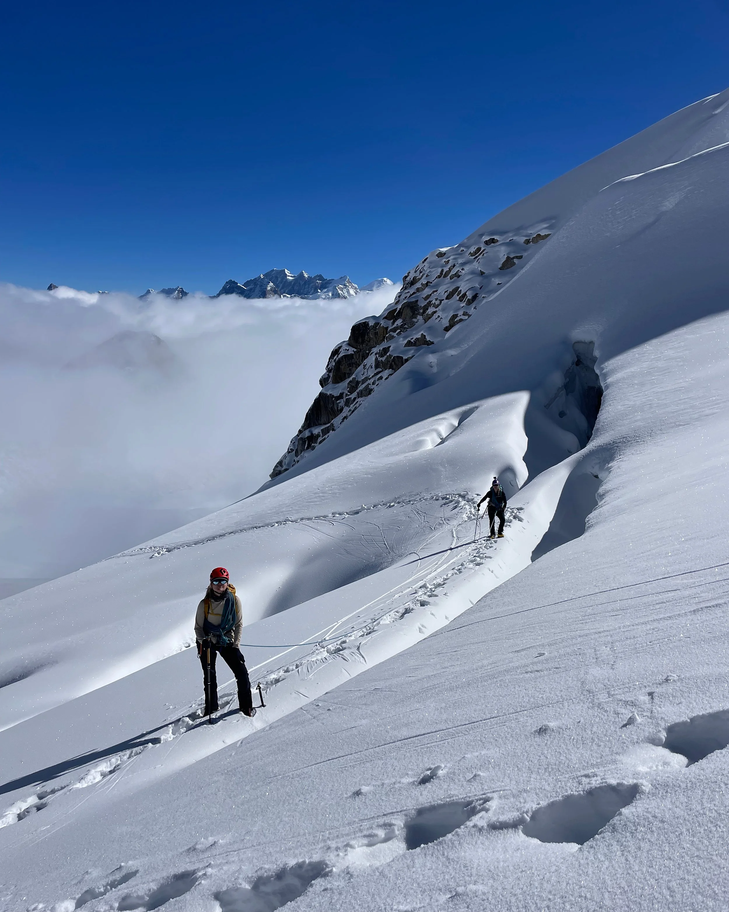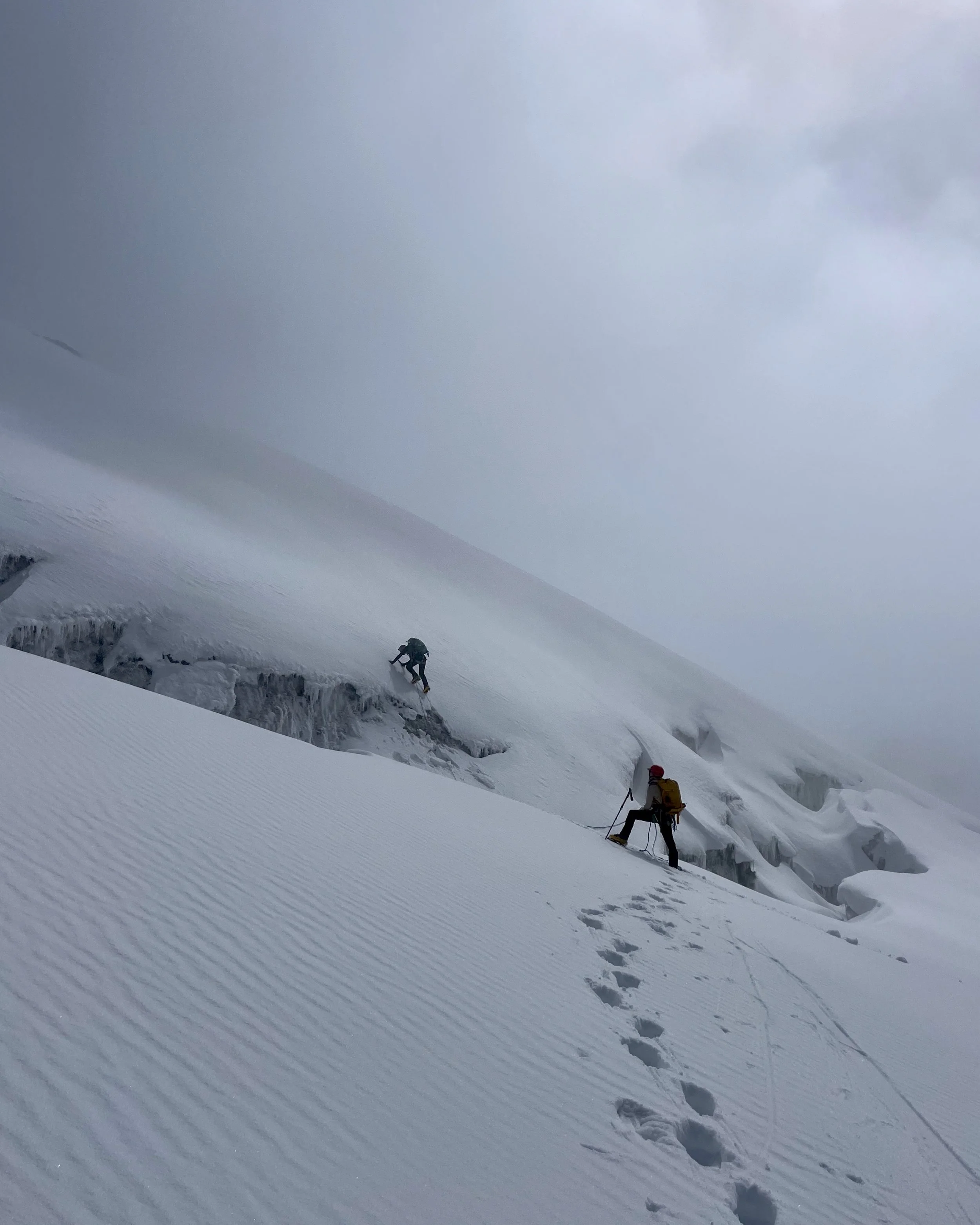 Kasia (front) and Ula aptly navigate a maze of crevasses as the terrain steepens, approaching the col at 5200m. Clouds hang in the valley below, soon to turn a foreboding shade of gunmetal grey and envelop our little mountain world as the weather deteriorates into the afternoon — a routine phenomenon we are becoming all too familiar with.